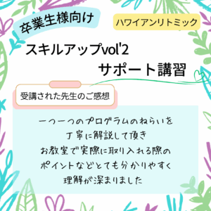 一つ一つのプログラムのねらいを丁寧に解説して頂き、資料や動画だけでは分からないお教室で実際に取り入れる際のポイントなど、とても分かりやすく理解が深まりました♡