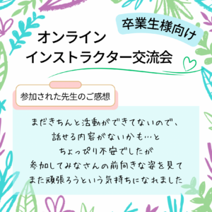 スキルアップ講座、レッスン見学会、交流会、開業支援などで卒業生様の活動を応援させて頂いております。